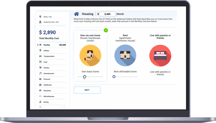What kind of place will you live in? Click on the statement below that best describes you or, if you know how much your housing will cost each month, enter that amount in the Monthly Cost box below.